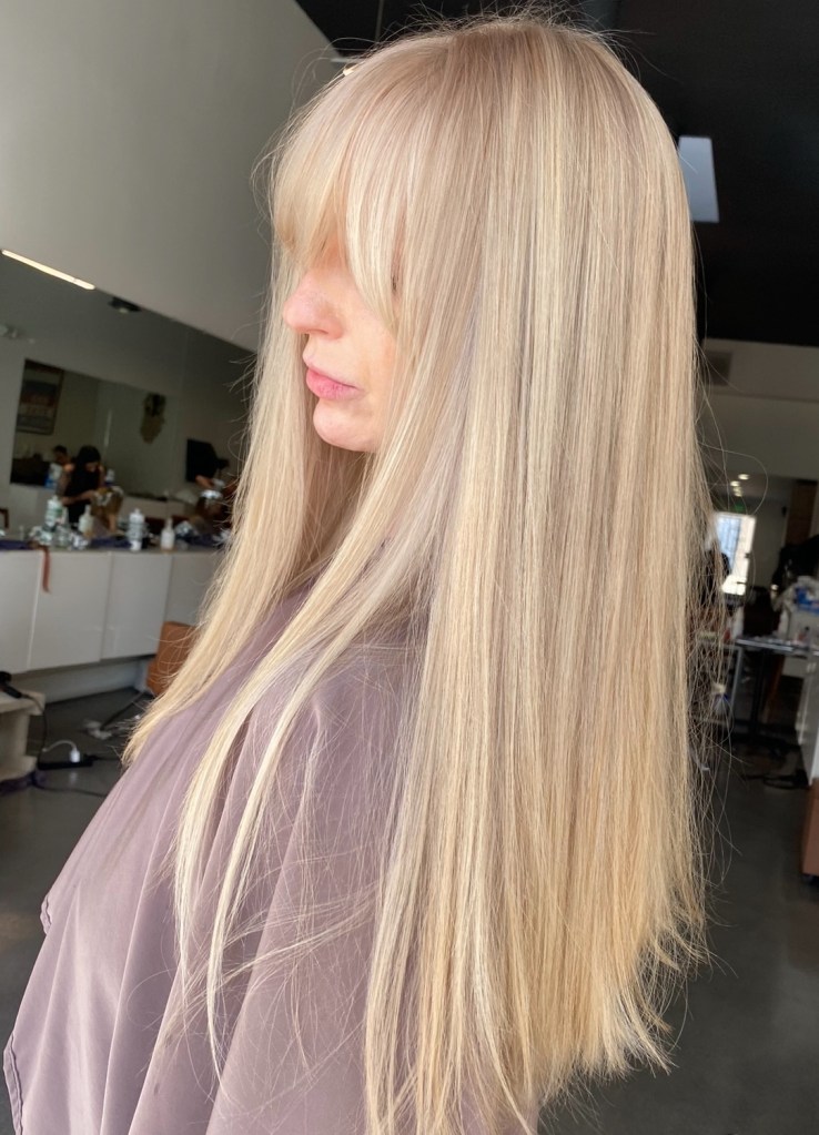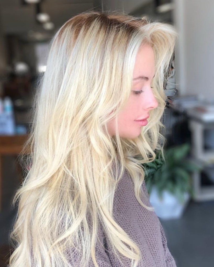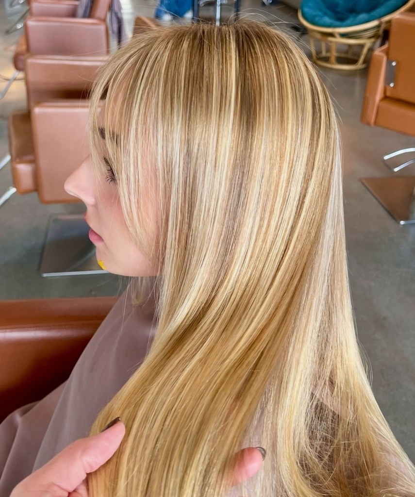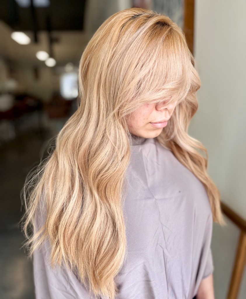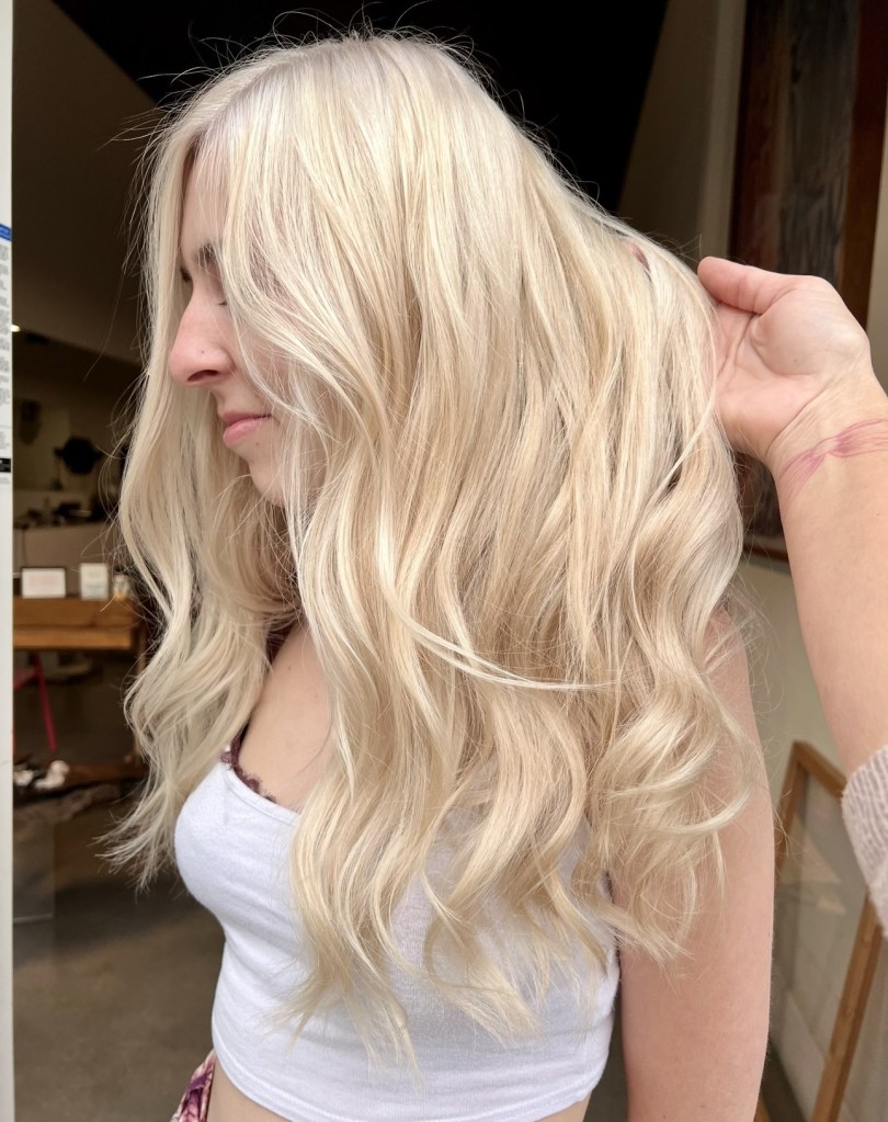 Champagne blonde is usually a neutral blonde with a warm undertone. I guess maybe picture looking at a glass of champagne? Again, this name can include so many different shades of blonde but it definitely is on the lighter side and I would say more of a basic clean blonde. Back in the day I used the term “champagne blonde” to describe blonde that had kind of a blush undertone to it, but now that so many peachy and pinky blondes have been popular I have stopped using the name champagne to describe anything but a true basic light blonde with undertones of a lemon beigeness.